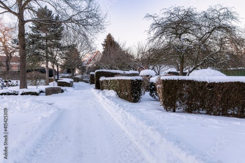 Naklejka premium Verschneiter Weg auf dem Friedhof beim Kloster Loccum im Winter Februar 2021