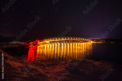 © U. Gernhoefer, Fototapeta premium Verschwommene Nachtaufnahme Brücke Sommaroy, Troms og Finnmark, Norwegen