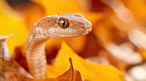 © MAY, Fototapeta premium Vertebrate Snake slithering through dry leaves with intricate scale patterns.