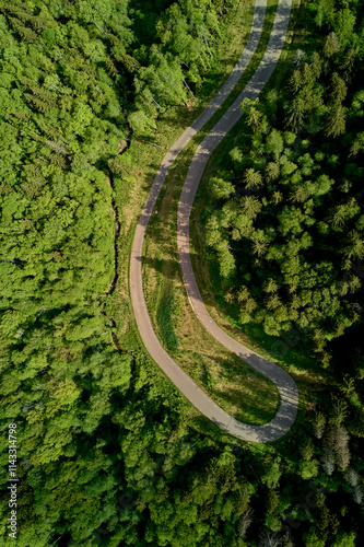 © PhotoChur, Fototapeta premium Vertical aerial view of a roller ski track in a forest area