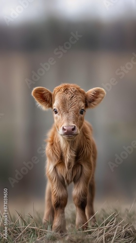 © Ametz, Fototapeta premium Vertical AI illustration adorable brown calf standing in field. Animals concept.