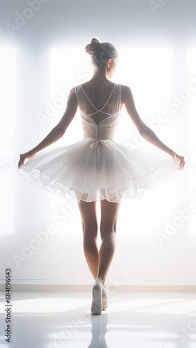 © kichigin19, Naklejka premium vertical background ballerina in light white scenery, pure creativity dance performance ballet