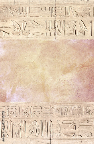 © frenta, Obraz premium Vertical background with ancient Egyptian hieroglyphs on stone wall, Egypt, Africa. Backdrop with sandstone carving with hieroglyph. Mock up template. Copy space for text
