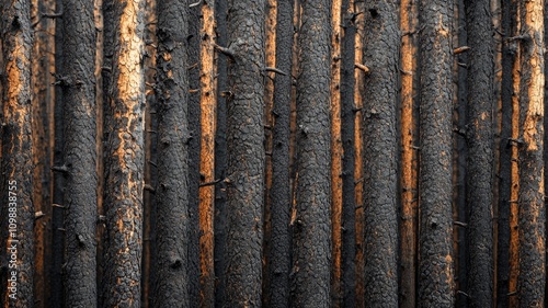 © VisionaryVibe, Fototapeta premium Vertical charred tree trunks in close-up pattern