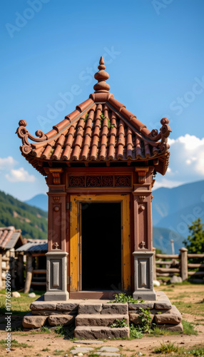 © Nattapun, Obraz premium Vertical Christian Wall Art Installation at Scenic Mountain Location Capturing Peaceful Outdoor Essence