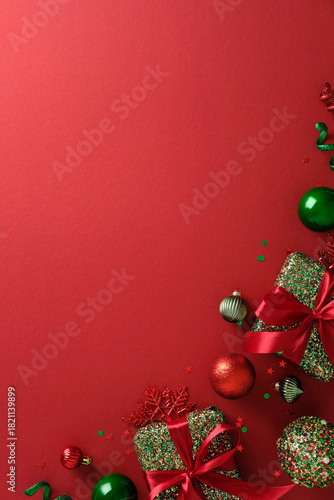 © photoguns, Naklejka premium Vertical Christmas background with red and green gifts and ornaments creating a corner border.