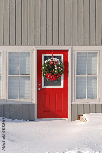 © Janice, Fototapeta premium Vertical Christmas themed winter image of a vibrant red front door in a grey wooden building with a Christmas wreath hanging on the door dusted with freshly fallen snow.