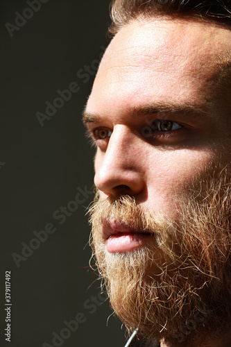 © face_reader_img, Fototapeta premium Vertical close-up of brutal man with ginger thick beard, looks thoughtfully aside, posing over black background.