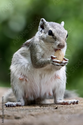 © Wirestock, Naklejka premium Vertical close-up shot of a chipmunk eating nuts on the ground