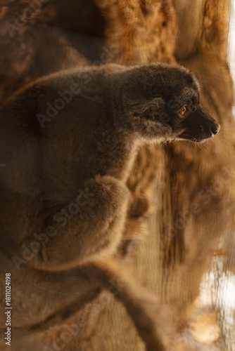 Obraz premium Vertical Close-Up Side View of a Brown Lemur Sitting on a Tree Branch in Warm Light at the Zoo