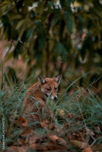 Obraz premium Vertical closeup shot of a red fox looking at the camera behind the green grass