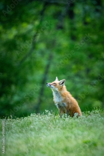 © Tennessee Photoworks/Wirestock Creators, Fototapeta premium Vertical closeup shot of a red fox sitting in the field and looking up against the green trees
