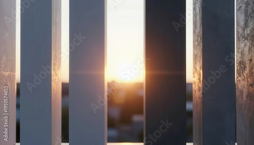 Obraz premium vertical columns silhouetted against a setting sun. The sun creates a warm glow behind the columns, enhancing the sunset scenery.