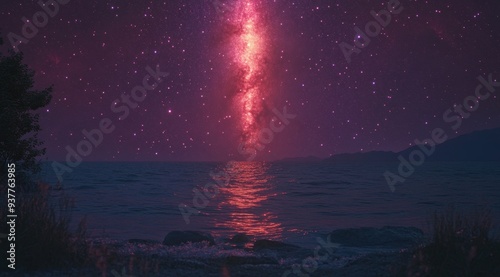 © Psykromia, Fototapeta premium Vertical Cosmic Light Reflecting on Ocean Under Starry Sky