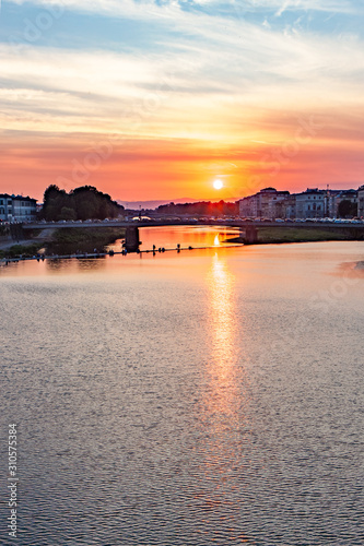 © Steve, Naklejka premium Vertical Crop Fiery Red Sun Setting on the Arno River in Florence