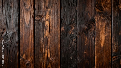 © ibhonk, Naklejka premium Vertical dark brown aged wooden planks display a rich, weathered texture.