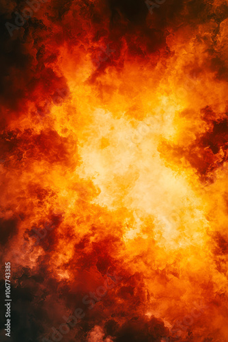 Obraz premium Vertical Dramatic fire and smoke effect glowing red and yellow colors exploding outwards with center space.