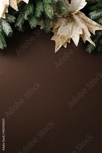 Fototapeta premium Vertical elegant Christmas background with frosted pine and gold glitter poinsettia along the top edge