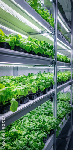Fototapeta premium Vertical farming system with stacked shelves of green leafy vegetables inside...