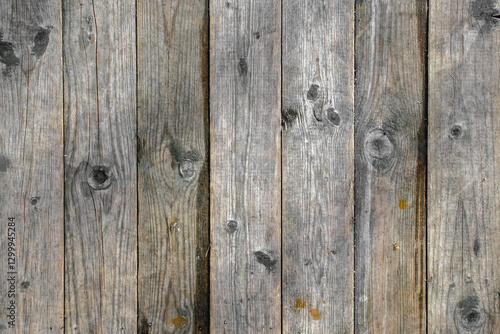 © Vladimir, Fototapeta premium Vertical fibers of an old board close-up. Knots and fibers on an old board. The board dries out and cracks over time. Knots and mold on the weathered part of the board.