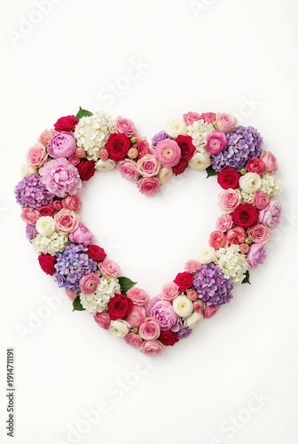 © NN AI, Obraz premium Vertical floral heart wreath with purple hydrangeas and pink ranunculus. Romantic background with copy space