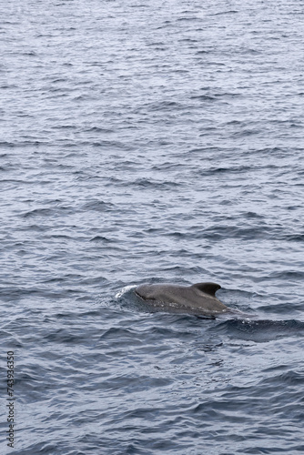 © Artem, Fototapeta premium Vertical frame of a pilot whale surfacing in the Norwegian Sea, its sleek form cutting through the water near Andenes, Norway