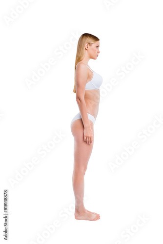 © deagreez, Fototapeta premium Vertical full length body size profile side view of nice attractive adorable lovely skinny thin sportive candid perfect healthy girl standing straight isolated over light gray background