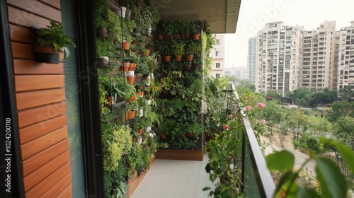 Fototapeta premium Vertical garden structure filled with green plants and flowers, enhancing a city apartments veranda with natural beauty.