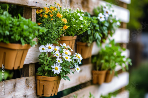 Naklejka premium Vertical garden with colorful flowers in pots on wooden pallet for stylish home decor and natural ambiance