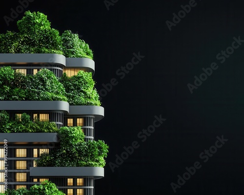 © Creator88, Fototapeta premium Vertical gardens and solar panels on sleek skyscrapers in a futuristic city, glowing softly in the night, clean energy-efficient design