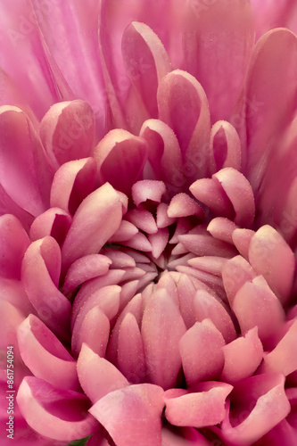 © Jerrry G, Fototapeta premium Vertical macrophotograph capturing details of a chrysanthemum blossom (mum) with bright pink petals.