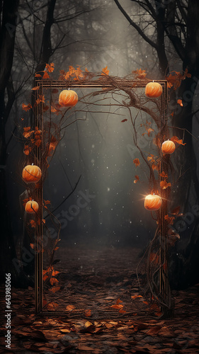 © kichigin19, Obraz premium vertical narrow frame of glowing lamps outside in the atmosphere of autumn mood and Halloween, greeting form