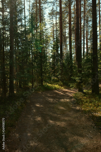 Naklejka premium Vertical outdoor shot of wide trail leading through coniferous wood. Chill and shadow in pine forest on sunny hot day. Hiking, adventure, tourism, summer, autumn and spring concept. No people