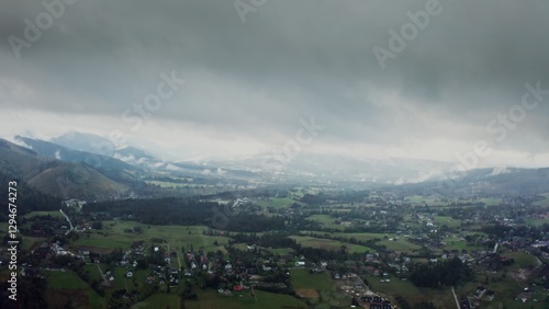 © m-art, Fototapeta premium Vertical panning from a drone, a view of mountain valley with city in a lowland at foot of gently sloping mountains overgrown with a spruce forest, on a cloudy day at dusk