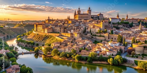 © Praphunsak, Fototapeta premium Vertical panoramic view of Toledo's old town with cathedral and river