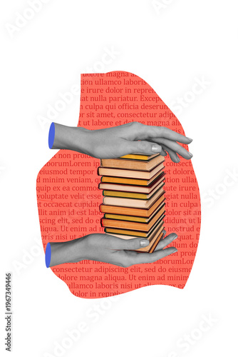 © deagreez, Obraz premium Vertical photo collage of hands hold book stack library education enlightenment encyclopedia reader hobby isolated on painted background