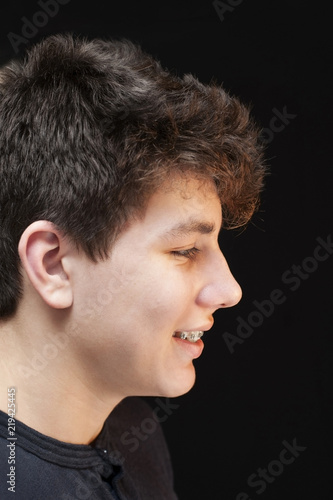 Obraz premium Vertical photo of a guy on a black background in profile. A boy smiles - the braces are clearly visible on the teeth