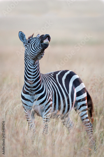 © stuporter, Fototapeta premium Vertical portrait of zebra showing its teeth in Masai Mara Kenya