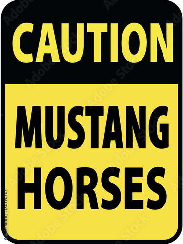© Dotana, Fototapeta premium Vertical rectangular black and yellow warning sign of attention, prevention caution mustang horses. On Board Trailer Sticker Please Pass Carefully Adhesive. Safety Products.