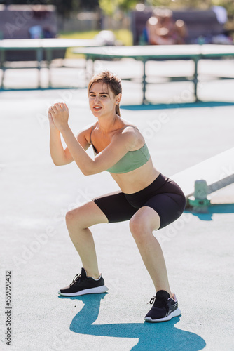 © Iona, Fototapeta premium Vertical shoot of caucasian tanned girl in sportswear makes squats at sport court looks at camera on sunny summer day. Fitness, sport, healthy lifestyle. Pretty young hispanic woman training outdoors