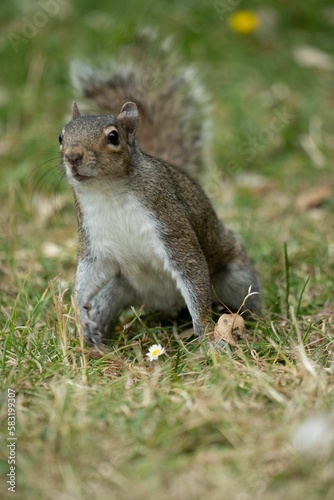 Obraz premium Vertical shot of a fluffy brown squirrel standing on a grassy field