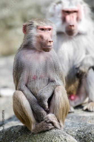 Naklejka premium Vertical shot of a hamadryas baboon sitting on a rock.
