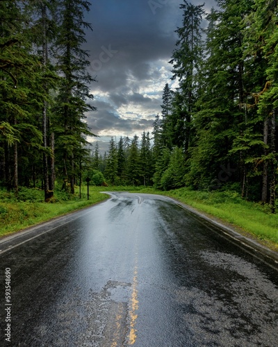 © Brett Bess/Wirestock Creators, Fototapeta premium Vertical shot of a highway road between trees with a stormy sky in the background