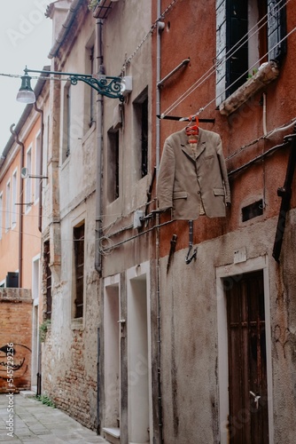 © Ksenia Lutsenko/Wirestock Creators, Fototapeta premium Vertical shot of a residential building with a hung suit in Venice, Italy