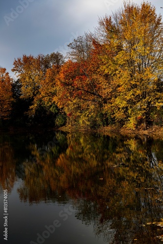 Fototapeta premium Vertical shot of a river reflecting an autumn forest with trees covered with orange leaves