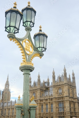 © Wirestock, Fototapeta premium Vertical shot of a street light on the background of Palace of Westminster