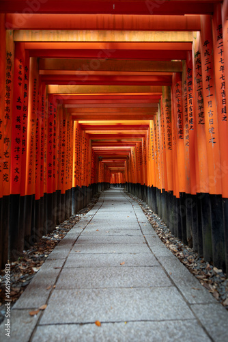 Fototapeta premium Vertical shot of a torii tunnel without people. The light passes through the...