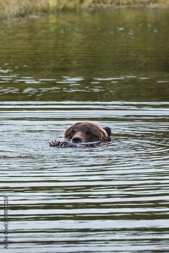 Fototapeta premium Vertical shot of a wet brown bear in the water pond in Alaska on a clear day