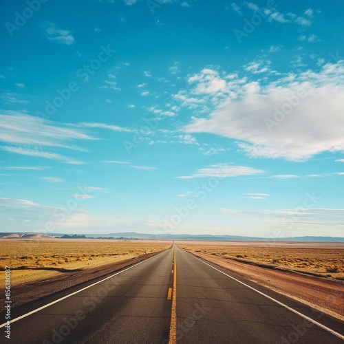 © creative01, Naklejka premium Vertical shot of an empty road in the middle of a desert under a beautiful blue sky