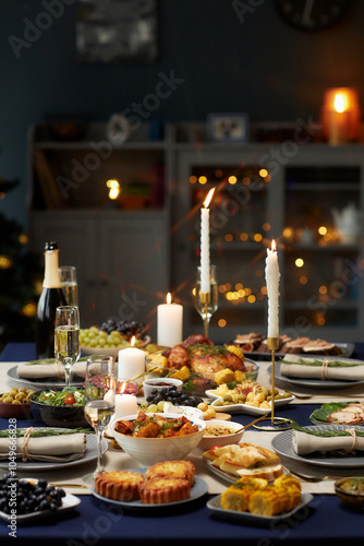 Naklejka premium Vertical shot of dining table set with variety of festive dishes, champagne glasses and lit candles while christmas lights are glowing in background, copy space